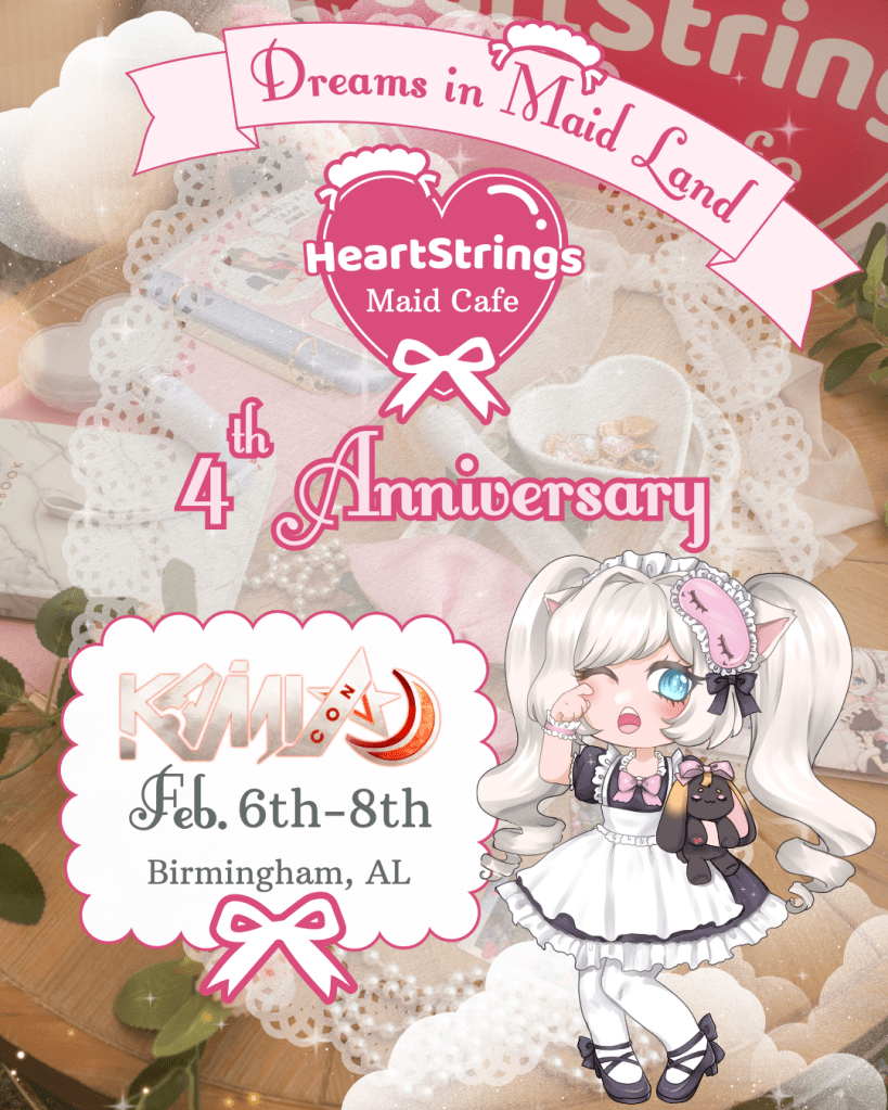 Welcome to the Heartstrings Maid Cafe! This magical mansion of maids travels the Southeast United States bringing the wonder and whimsy of Akihabara’s maid cafe culture with it. Come experience a delightful treat served by adorable maids and handsome butlers, see energizing dance performances and be charmed by irresistible entertainment. The HSMC is an all ages experience!